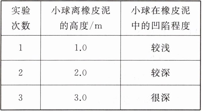 |实验次数|小球离橡皮泥的高度/m|小球在橡皮泥中的凹陷程度|