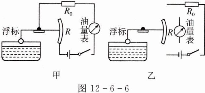 8. 图 12 - 6 - 6 甲表示一种自动测定油箱内油面高度的油量表(实际上是量程为 0~0.6 A 的电流表改装而成),滑动变阻器 R 的最大阻值为 60 Ω,金属杠杆的右端是滑动变阻器的滑片,从油量表指针所指的刻度,就可以知道油箱内油面的高度,电源电压为 24 V,$ R_{0} $ 为定值电阻。