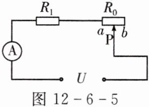 7. 如图 12 - 6 - 5 所示的电路中,电压 $ U = 6 $ V,且保持不变;$ R_{1} = 6 \Omega $,$ R_{0} $ 为滑动变阻器,其最大阻值为 9 Ω。求当滑片 P 由 b 移动到 a 的过程中电流表示数的变化范围。