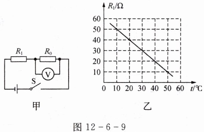11. 小明设计了一个用电压表的示数变化反映环境温度变化的电路,其电路原理图如图 12 - 6 - 9 甲所示,其中,定值电阻 $ R_{0} = 20 \Omega $,$ R_{1} $ 是热敏电阻,其阻值随环境温度变化的关系如图 12 - 6 - 9 乙所示,闭合开关 S 后:
