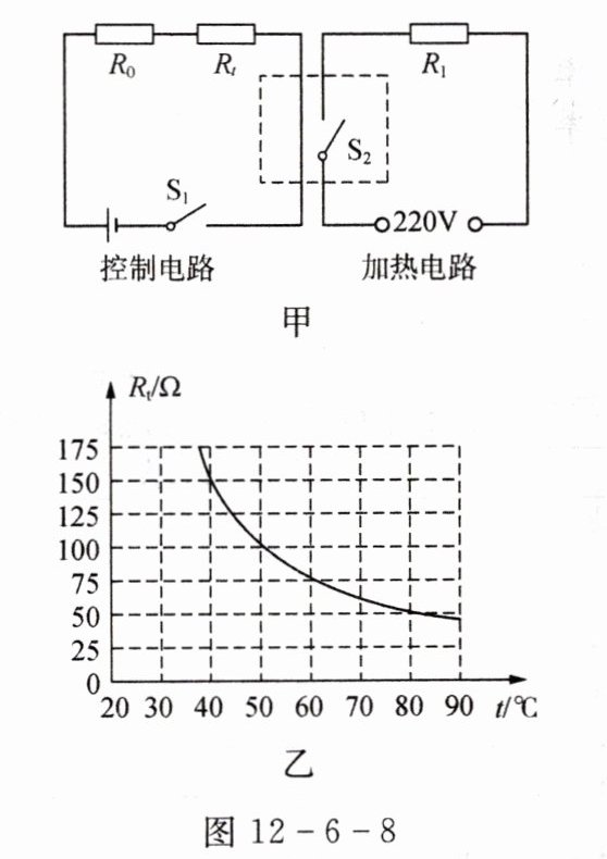 10. 某电热水器内部简化电路如图 12 - 6 - 8 甲所示,由控制电路和加热电路组成。控制电路中电源电压保持不变,$ R_{0} $ 为 250 Ω,$ R_{t} $ 为热敏电阻,其阻值随水温的变化关系如图 12 - 6 - 8 乙所示;加热电路中电源电压为 220 V,加热电阻 $ R_{1} $ 阻值为 20 Ω。当热水器中水温降到 40 ℃时,控制电路中电流减小到 30 mA,电流感应开关 $ S_{2} $ 闭合,加热电路开始加热;当水温上升至临界温度时,控制电路中电流增大到 40 mA,电流感应开关 $ S_{2} $ 断开,加热电路停止加热。求: