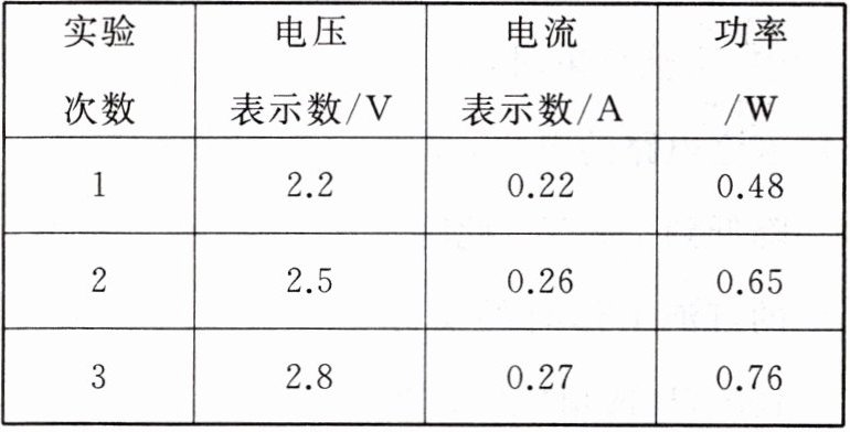 |实验次数|电压表示数/V|电流表示数/A|功率/W|