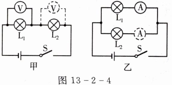 (3)有位同学又在原有器材的基础上继续探究,连接方式如图 13 - 2 - 4 乙所示,闭合开关 S,看到小灯泡$ L_1 $一闪即灭,经检查发现灯丝断了,请你分析原因并说明改进方法。