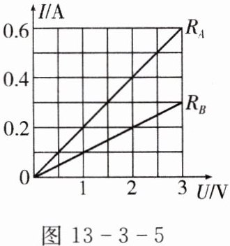 12. 两定值电阻 $ R_{A} $ 和 $ R_{B} $ 中的电流与其两端电压的关系如图 13 - 3 - 5 所示,若将两个电阻并联接在电压为 2 V 的电路中,干路上电流为