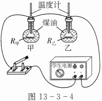 8. 如图 13 - 3 - 4 所示是探究电流与电热关系的实验装置,除了灯丝电阻 $ R_{甲} > R_{乙} $ 外,其余条件均相同。开关闭合,电路接通后,下列对甲、乙两瓶的对比分析和判断正确的是(