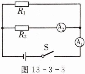 7. 如图 13 - 3 - 3 所示,电源电压恒定,电阻 $ R_{1} $ 为 20 Ω,$ R_{2} $ 为 10 Ω,闭合开关 S,电流表 $ A_{1} $、$ A_{2} $ 的示数分别为 0.9 A 和 0.6 A。求: