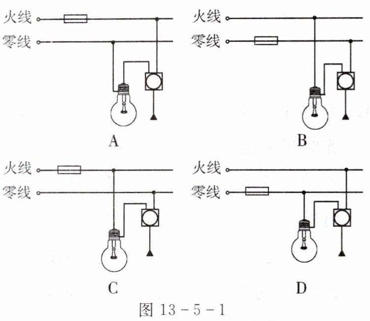 9. 如图 13 - 5 - 1 所示是某家庭电路的四盏电灯的安装方法,你认为其中正确的是(