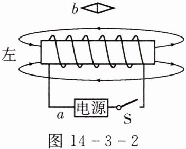 3. 如图 14 - 3 - 2 所示,根据通电螺线管的磁感线方向,可判断通电螺线管左端为