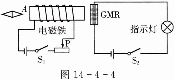 6. 如图 14 - 4 - 4 所示,GMR 是巨磁电阻(其电阻值在磁场中随磁性的增强急剧减小),当开关$ S_1、$$S_2 $都闭合时,电磁铁附近的小磁针处于静止状态,则小磁针的 A 端为