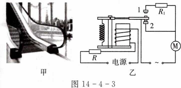 5. 小霖乘坐电梯时发现了一种“聪明的电梯”,如图 14 - 4 - 3 甲所示,他通过网络搜索到这种电梯如图乙所示的简易控制电路,R 是一个压敏电阻,其电阻阻值随压力的增大而减小。据图分析:当人走下电梯后,电磁铁的磁性变