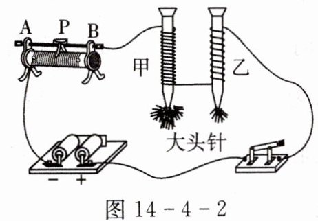 4. 冬冬将漆包线(表面涂有绝缘漆的铜线)绕在两个完全相同的铁钉上,制成了简易电磁铁甲和乙,按如图 14 - 4 - 2 连接好电路,探究“影响电磁铁磁性强弱的因素”。请你结合该实验中的具体情况,完成下面的内容。