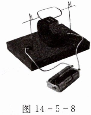 11. 小梦参加了制作电动机模型活动,她将一段漆包线绕成约为 3 cm×2 cm 的矩形线圈,且漆包线在线圈的两端各伸出约 3 cm,然后用小刀刮两端引线的漆皮,并将该线圈放在支架上。线圈两端的引线通过两个支架分别与电池的两极相连,如图 14 - 5 - 8 所示。给线圈通电并用手轻推一下,线圈就会不停地转下去。