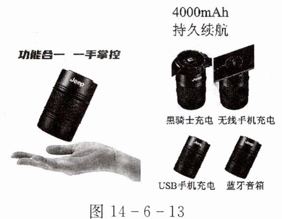 通信业的发展和智能手机的普及促使各种配套设备应运而生,如图 14 - 6 - 13 是一款新型的充电宝,它是集成了无线手机充电、智能手表充电、USB 有线充电、蓝牙音箱四种功能的充电宝。充电宝上面可以供智能手表进行磁吸式充电;充电宝下面是无线充电设备,利用送电线圈产生磁场。手机中的受电线圈靠近该磁场时就会产生电流,给智能手机充电;充电宝配有蓝牙音箱,可以与手机无线连接播放音乐。充电宝采用 4000 mAh 大容量电池,并且采用“超级快充”技术。不到半小时可把充电宝电池的电量充达一半以上,极大方便了人们的生活。