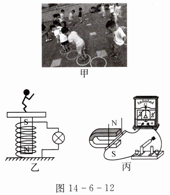 12. 幼儿园游乐室里有一种深受孩子们喜爱的设备——“跳跳乐”,如图 14 - 6 - 12 甲所示。当小朋友们在上面跳跃时,小灯泡会一闪一闪地发光。小东想对“跳跳乐”发光的原理进行探究。于是找来说明书,并根据其原理图(如图乙所示),找来磁铁、导线和灵敏电流计等材料。