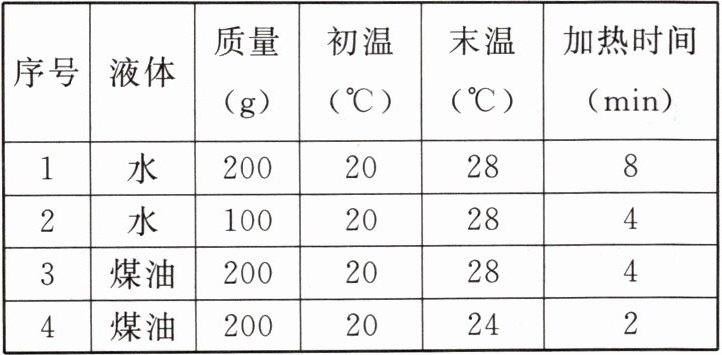 |序号|液体|质量(g)|初温(℃)|末温(℃)|加热时间(min)|