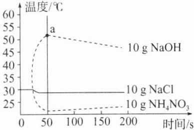 6. 利用手持技术数字化实验测定物质溶解过程的温度变化,将NaOH、NaCl、$NH_4NO_3$固体各10g分别放入盛有100mL水的锥形瓶中充分溶解。在不同时间测量溶液的温度,绘制成图像如图所示。分析图像,回答问题。