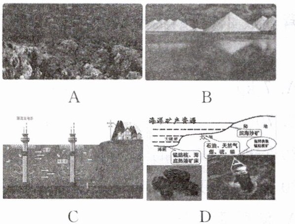 、氯化镁、硫酸镁、溴化钠等的化学资源;C为海洋产生的潮汐能、波浪能等能源资源