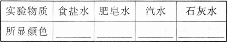 。(2)取所选花汁少许分别滴入上述四种物质,请将所显颜色填入下表中。