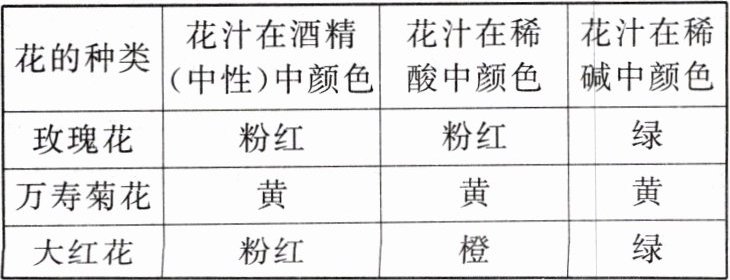 【设计并实施实验】学习小组的同学留取了以下三种花的汁液带回实验室,在老师的指导下用稀酸溶液和稀碱溶液检验,其颜色变化如下表所示。