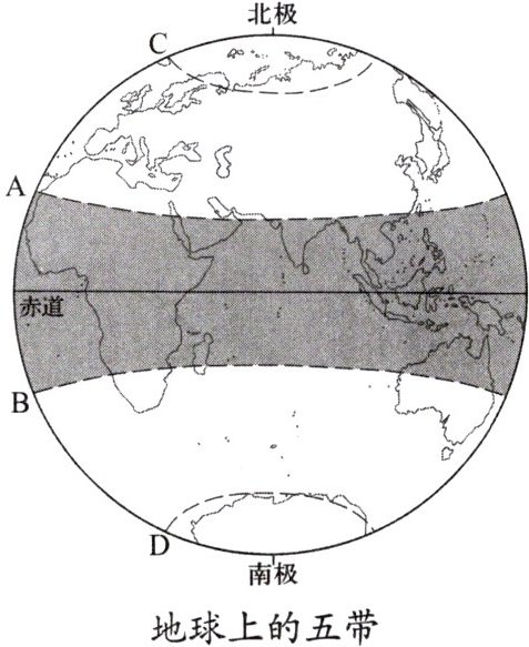(2)图中字母A和B之间的区域,一年中获得的热量较多,终年炎热,属于