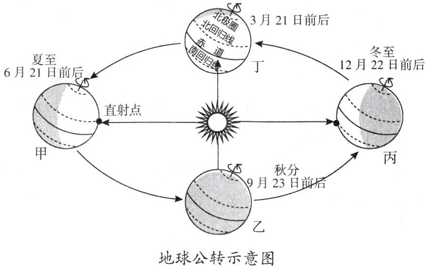 个月。(3)甲、乙、丙、丁四个位置中,太阳直射点在南回归线的是