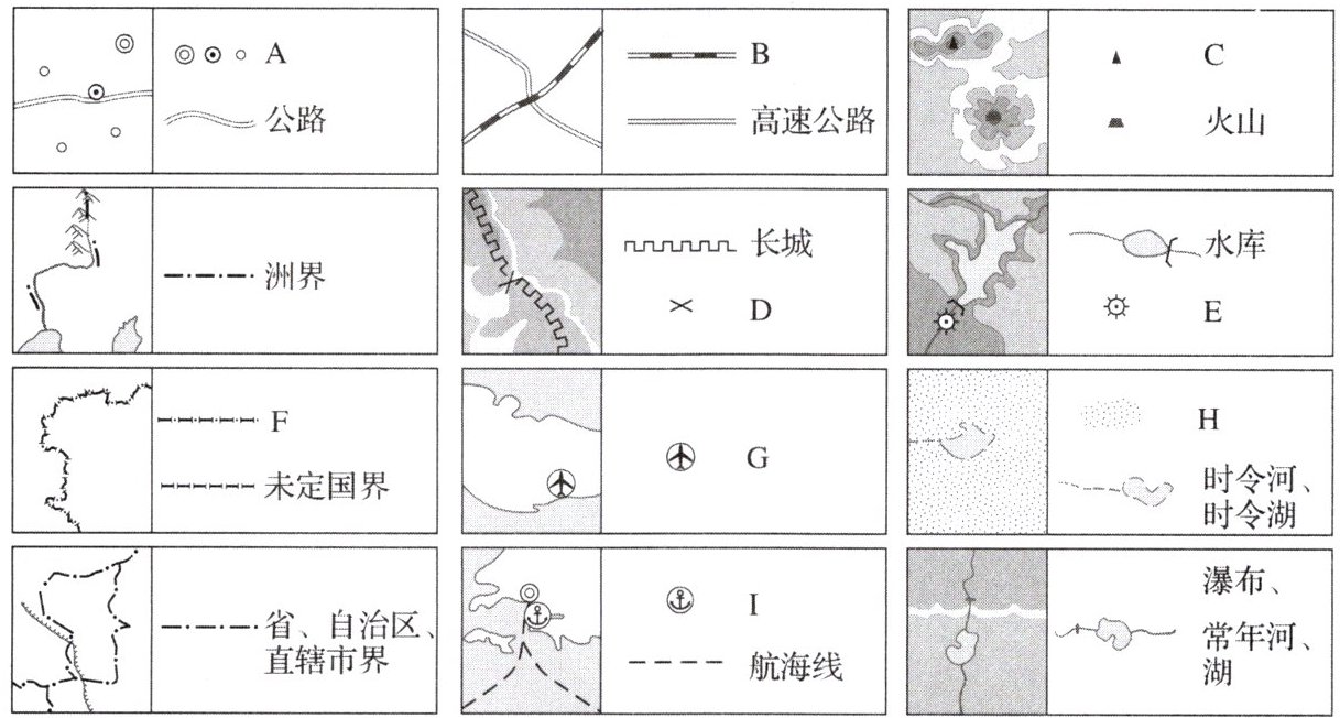 (1)A居民点 B铁路 C山峰 D关隘 E水电站 F国界 G飞机场 H沙漠 I港口