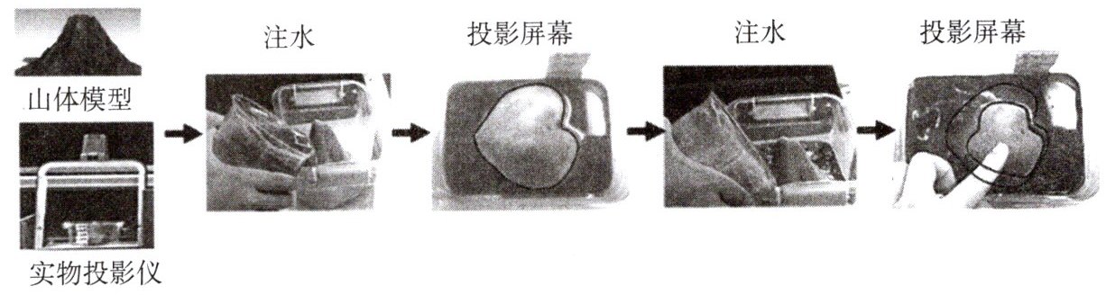步骤三:将山体模型放置在水槽中,向水槽中注入1厘米深的水。利用实物投影仪俯视模