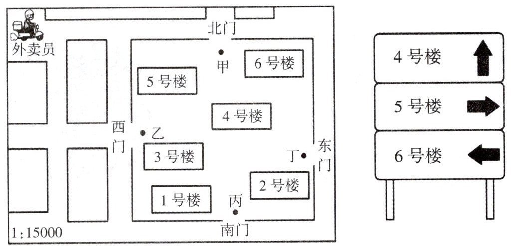 6.图中甲、乙、丙、丁为小区楼号指示牌放置区,当外卖员从大门进入小区后,看到如图所示的指示牌,外卖员可能进入小区的大门是 (