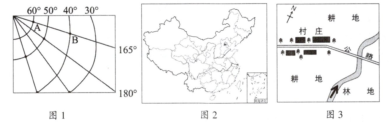 下面为三幅不同类型的地图,在图中判断方向的方法不同。据此完成1~3题。