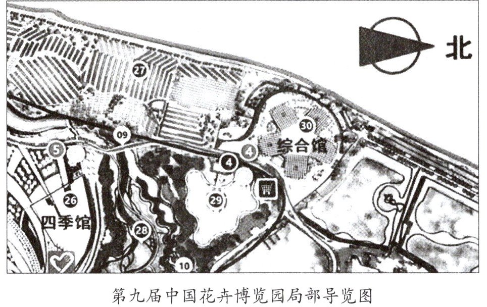 国庆假期,玲玲参观了中国花卉博览园,并拍下博览园的局部导览图与同学们一起分享。下图为“第九届中国花卉博览园局部导览图”。据此完成4~5题。