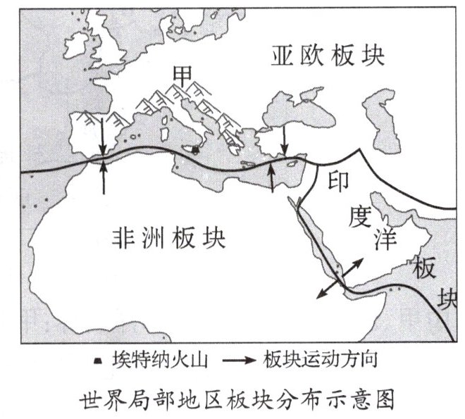 意大利埃特纳火山是欧洲最高、活动最频繁的活火山。下图为“世界局部地区板块分布示意图”。据此完成8~10题。