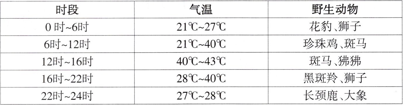 某自然保护区内有一处人工水塘。干季时,每天都有大量野生动物前来饮水,摄影师前往拍摄。下表示意“某自然保护区某日不同时段的气温与可拍摄到的动物”。据此完成3~5题。