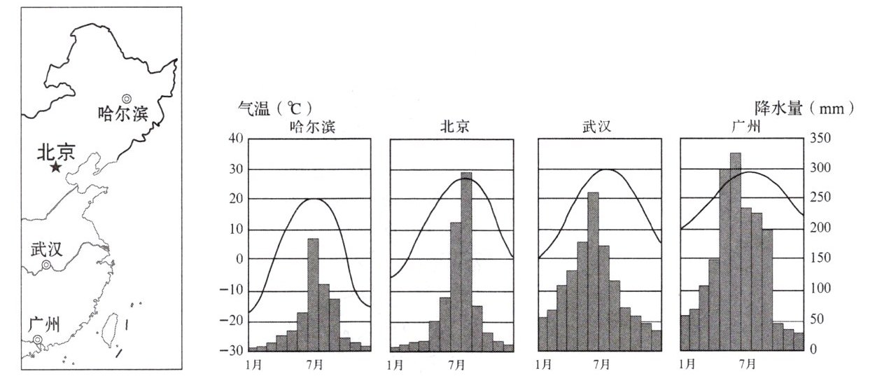 A.哈尔滨属于温带大陆性气候 B.北京属于温带海洋性气候
