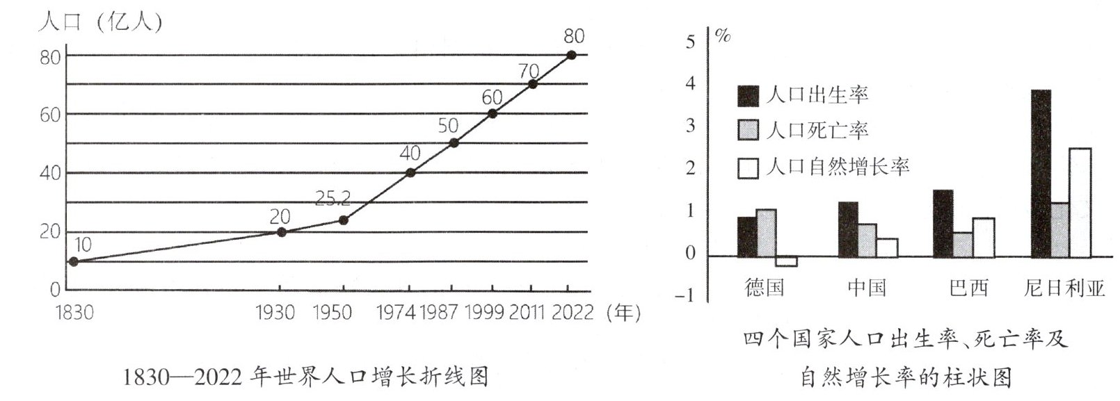 世界人口总数目前已突破80亿。下图为“1830-2022年世界人口增长折线图”和“四个
