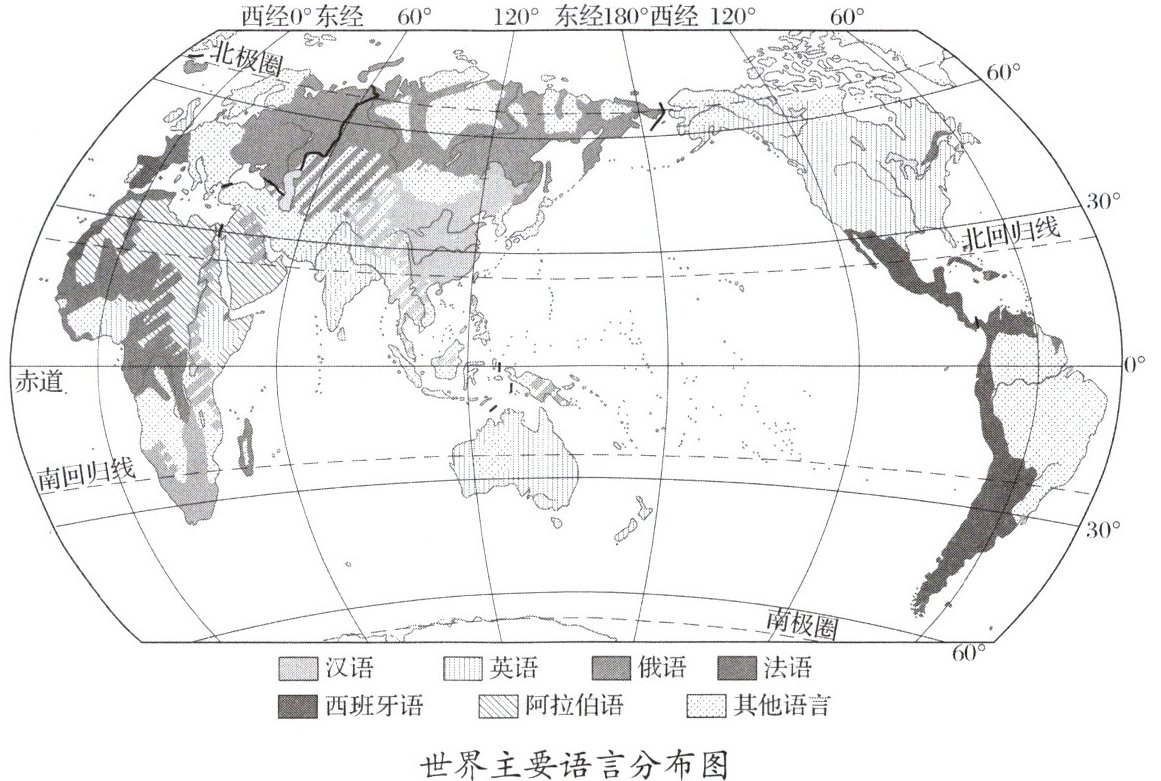 读“世界主要语言分布图”,完成1~2题。