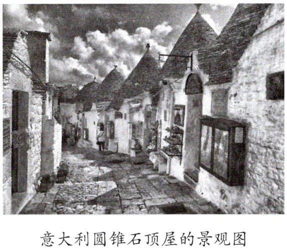 意大利阿普利亚地区位于地中海沿岸,这里房屋的墙壁、烟囱以及屋顶圆锥的顶端刷上白灰,墙体较厚(有的达两米厚),窗户很小。白色建筑群与地中海的蓝天白云十分和谐。右图为“意大利圆锥石顶屋的景观图”。据此