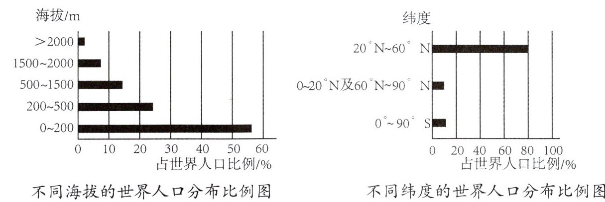 读“不同海拔的世界人口分布比例图”和“不同纬度的世界人口分布比例图”,完成