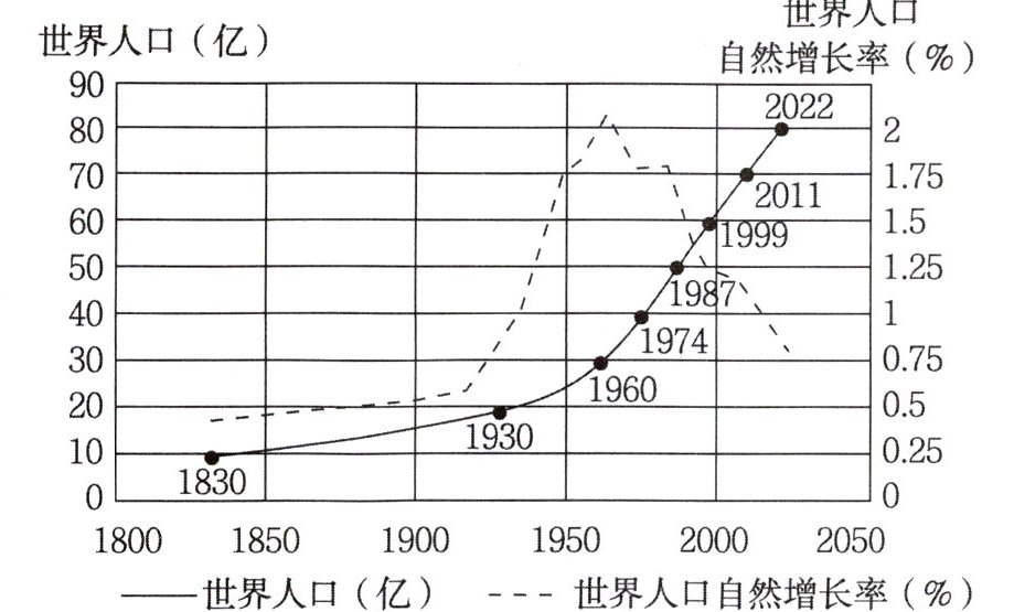 2022年11月15日,全球人口达80亿。下图示意了1830-2022年世界人口及世界人口