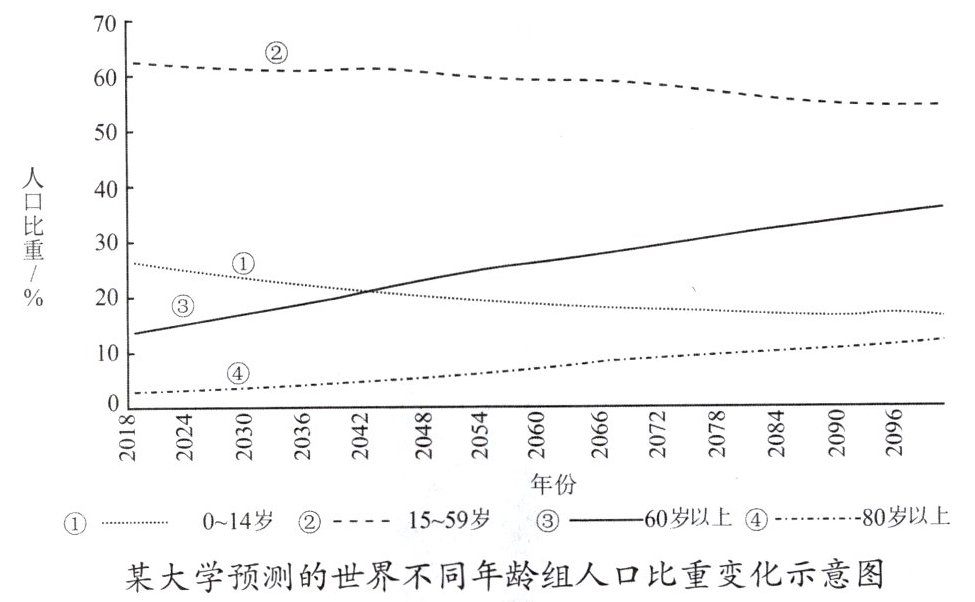 读“某大学预测的世界不同年龄组人口比重变化示意图”,完成5~7题。