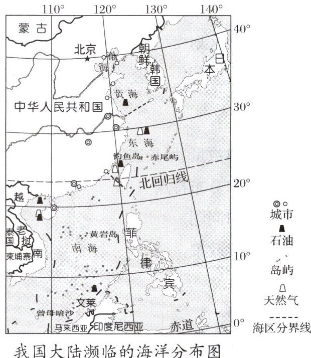 中国既是陆地大国,也是海洋大国,领土辽阔。读我国大陆濒临的海洋分布图,完成 1 - 4 题。