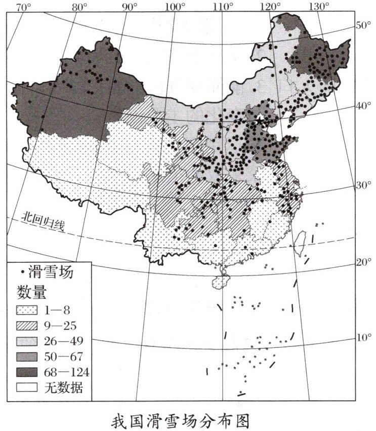 带,冬季气温较低,有利于滑雪场的修建。(2)我国滑雪场数量多于 68 个的省级行政区有