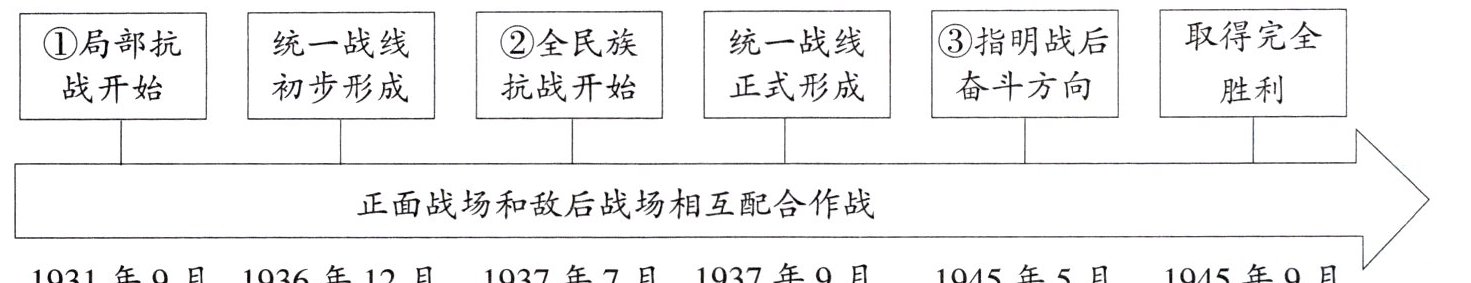 |①局部抗战开始|统一战线初步形成|②全民族抗战开始|统一战线正式形成|③指明战后奋斗方向|取得完全胜利|