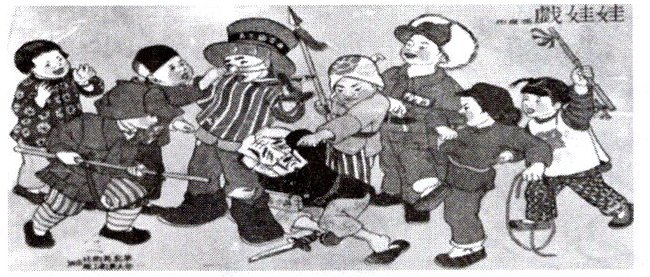 4. 下面是画家冯真的年画《娃娃戏》。扮演人民解放军和群众的小朋友们愤怒地围攻戴着写有“美帝国主义”高帽和戴着蒋介石假面的两个小朋友。这幅漫画最可能创作于( )