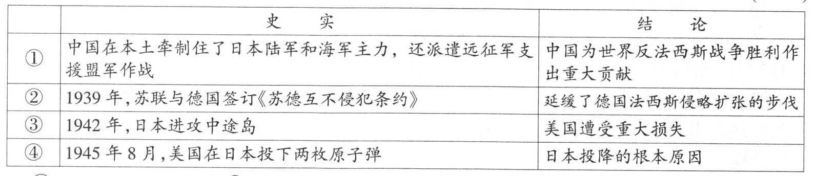 6.(1)具体史实:1940年,英国军民面临大轰炸坚持战斗;1941年6月,苏联赢得莫斯科保卫战的胜利;中国战场坚持抗战,牵制大量日军。(2)世界反法西斯联盟的形成。世界反法西斯力量互相配合,共同打击法西斯势力。