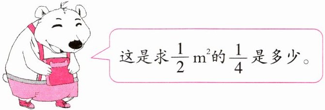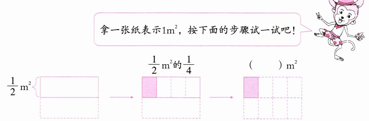 如果把另一个$$ \frac{1}{2} m^{2} $$也平均分成4份,从图中很容易看出$$ \frac{1}{2} m^{2} $的$ \frac{1}{4} $$,就是$$ 1 m^{2} $的$ \frac{( )}{( )} $$。