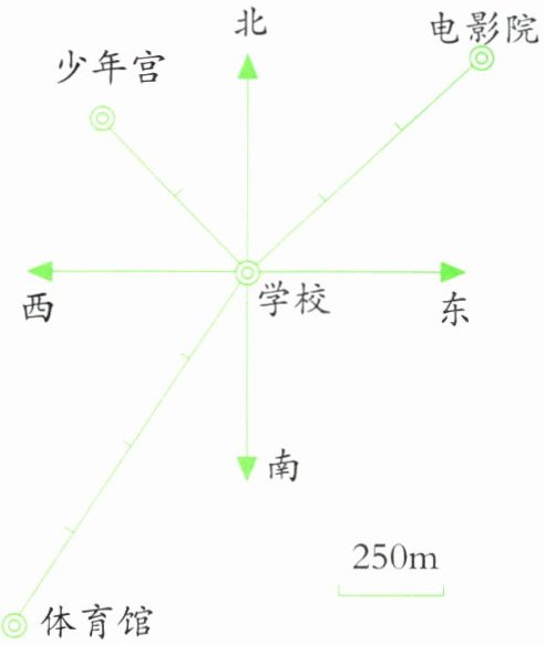 1. 游乐场:以剧院为起点,向东偏北45°方向,量取2.5个单位长度(50m÷20m=2.5)处标注。