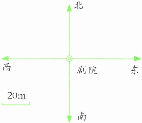 2. 塔碑:以剧院为起点,向正西方向,量取4个单位长度(80m÷20m=4)处标注。