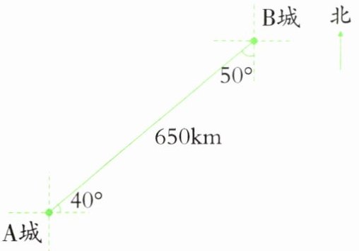 B 城在 A 城东偏北$40^{\circ}$(或北偏东$50^{\circ}$)方向,距离 A 城$650km$处。