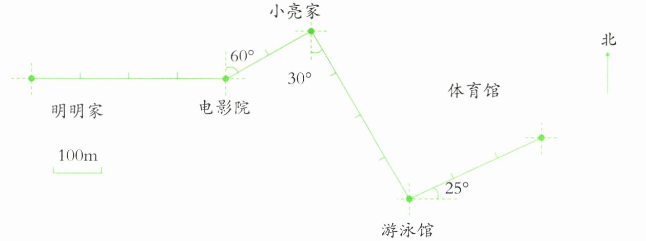 假设明明从体育馆出发,先向东走200米到达图书馆,再向东南方向走150米到达公园,然后向南走100米到达超市,最后向西走50米到家。