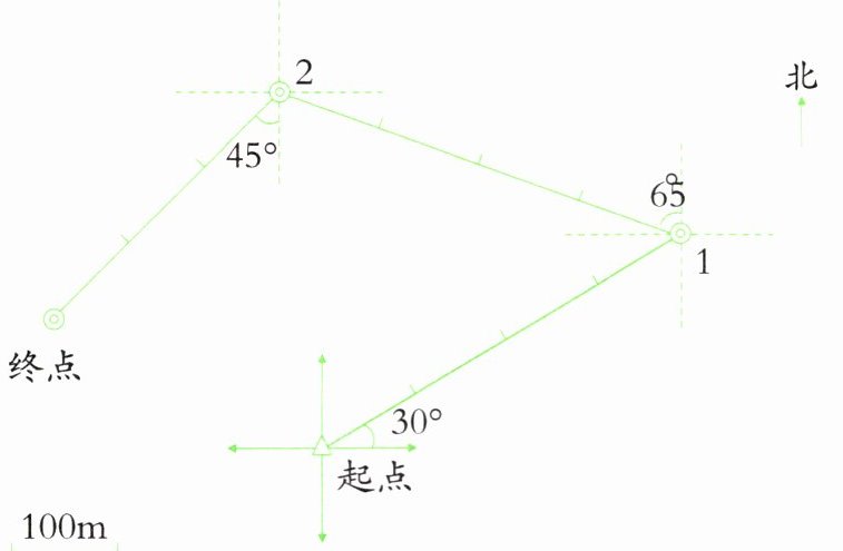 A到起点:方向南偏西$15^{\circ}$,路程$2000m$。